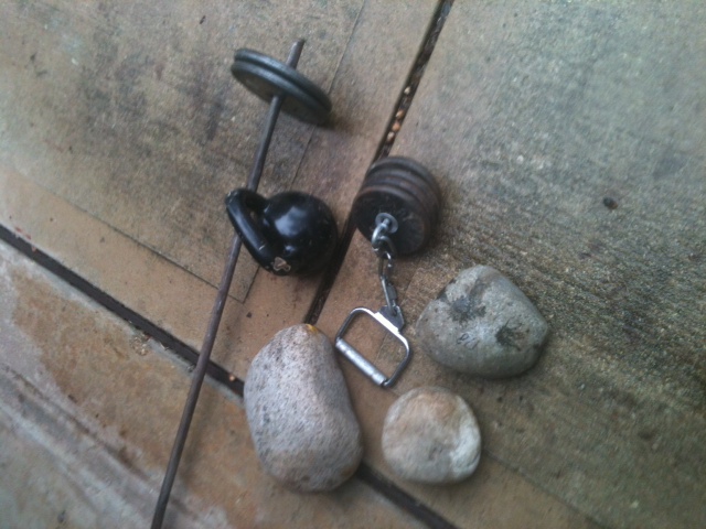 I had an idea for adding some instability to the kettlebell, so it's more like a WFD. If I took one of my 16kg (~35 lbs) KB and wrapped a thin-linked chain around the handle and attached a shovel handle to it with about two inches of links between the KB and shovel handle, that would, I think, give me an approximation of a WFD implement (until I save up for a real one).