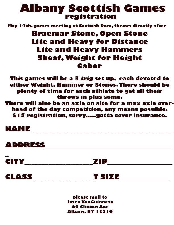 Hey folks. I'm planning to hold a games in Albany, NY on May 14th. Kind of a decent way for all of the folks in the NE to see where they're at after the off season training and to shake off some of that throwing rust. I've got a great field right in the city, over an acre, all flat, close parking. Planning to contest all 9 events. I'd also like to bring along a 2" axle for folks if they want to play with some DL or Overhead stuff. 2 trig set up. We're not going to run the day for speed or anything...but I also would like folks to stay warmed up for the day. Decent officials are worked out, so throwers should be able to come and do just that, concentrate on their throwing. All ages, weights and genders welcome. I'll be more than happy to accommodate any classes. $15 reg fee.....which will cover a t shirt for every entrant registered prior to May 1. I'll also get some trophies/awards with whatever is left over. PA and ipod dj if no one objects. Hope to see you all there.