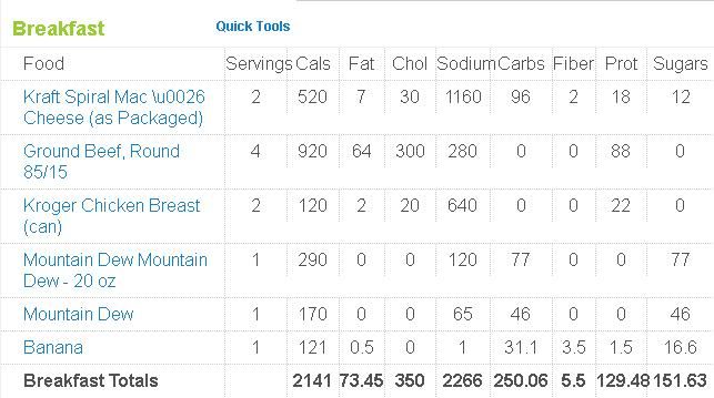 I have used this program before and if you have a smart phone feel free to use it. The last time I used it I lost about 30 pounds.  So I am going to use it again as it is more handy than writing everything down or trying to remember what you have eaten from the day. http://fatsecret.com It calculates your RDI you need to have.  There are many other functions and the web-site is fun to explore.  I have found very few items that it didn’t actually have in their database.  Here are my calories for day one.