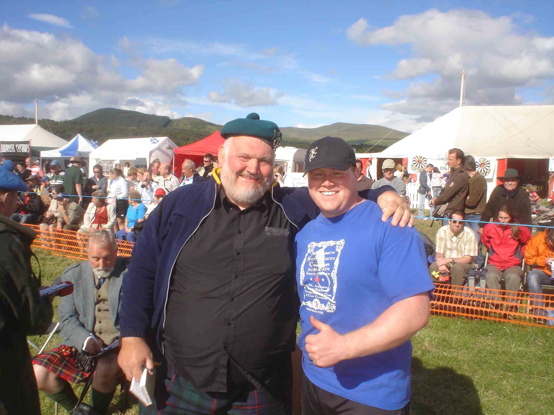 On my right is Tom McClure, a top AMerican strongman and the largest human I've ever seen. I think he said he was 6'5 and 380lbs at the time that pic was taken. It all went down at the Callander games in Scotland. It was cool to see those dude's in action. I also met Mark Felix there.